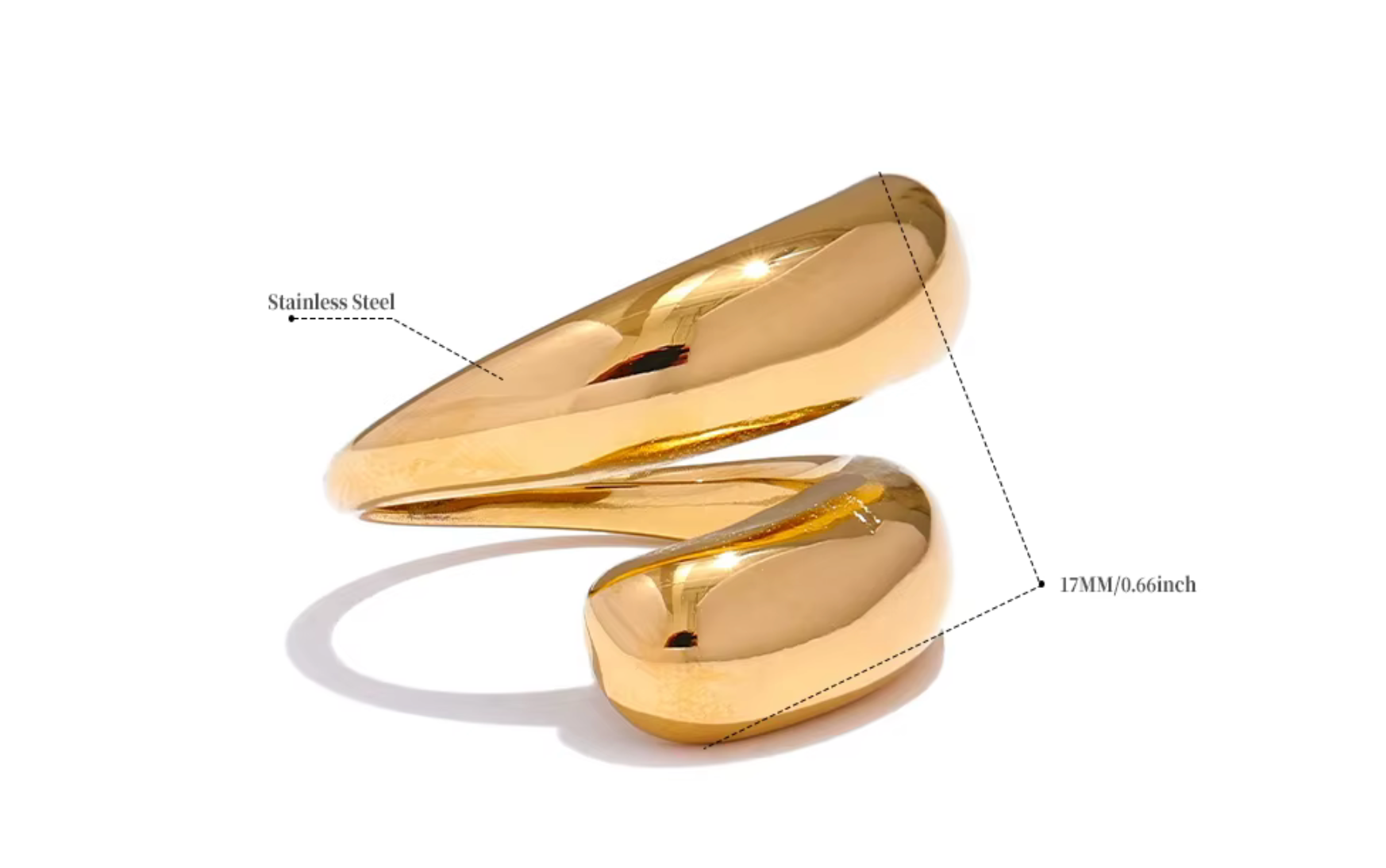 Gemaakt uit stainless steel en afgewerkt met een duurzame goudpatina, heeft deze ring een hoogglanzend oppervlak dat het licht vangt zonder scherpte. De open constructie zorgt voor draagcomfort en een lichte, flexibele pasvorm, terwijl het sculpturale volume een uitgesproken aanwezigheid behoudt.