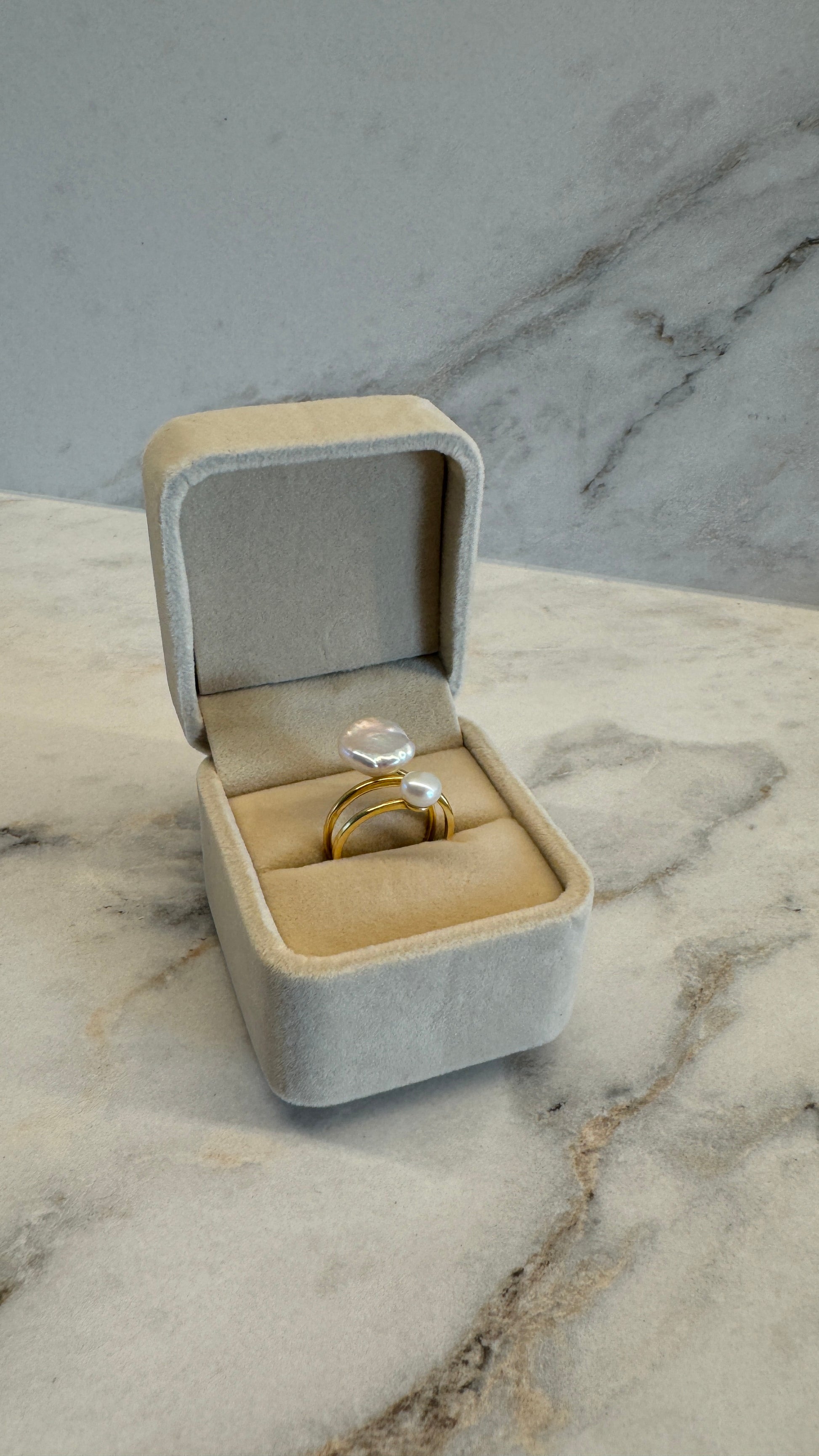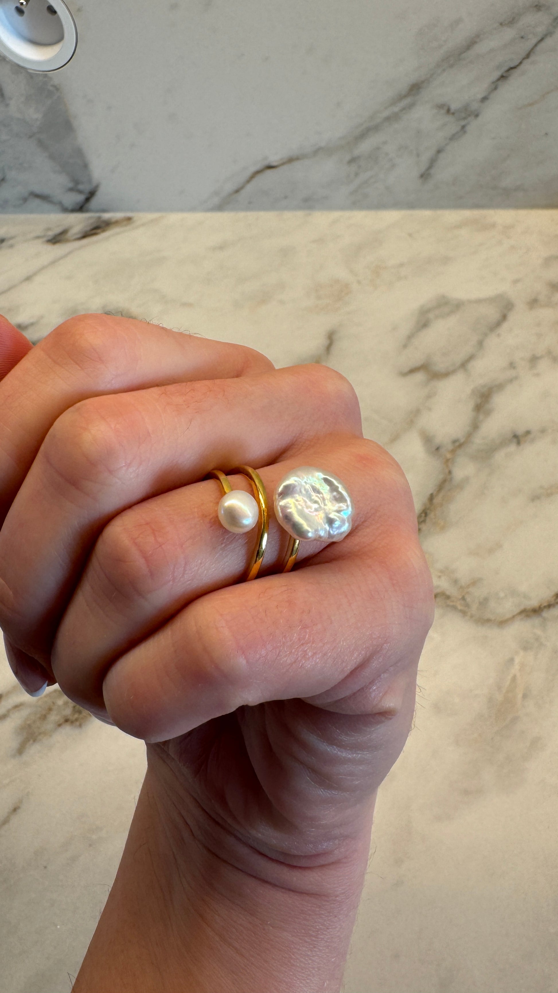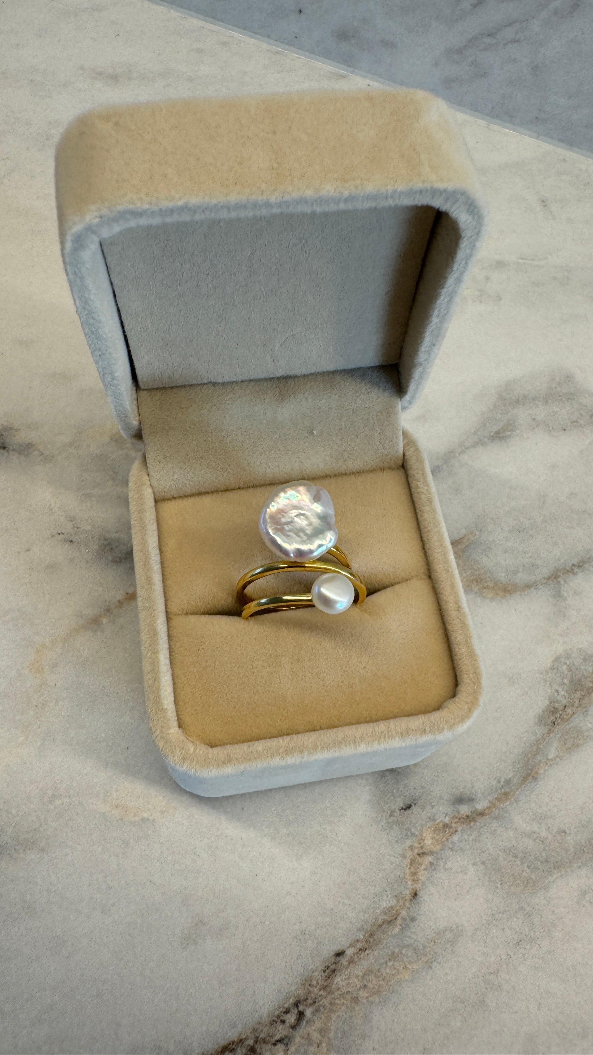 Deze ring uit de Monet+ collectie speelt met contrast: de organische vorm van een handgeselecteerde coin-keshi parel gecombineerd met de verfijnde harmonie van een ronde witte parel. Het resultaat is een sculpturaal statement dat zacht om de vinger rust en moeiteloos luxe uitstraalt.