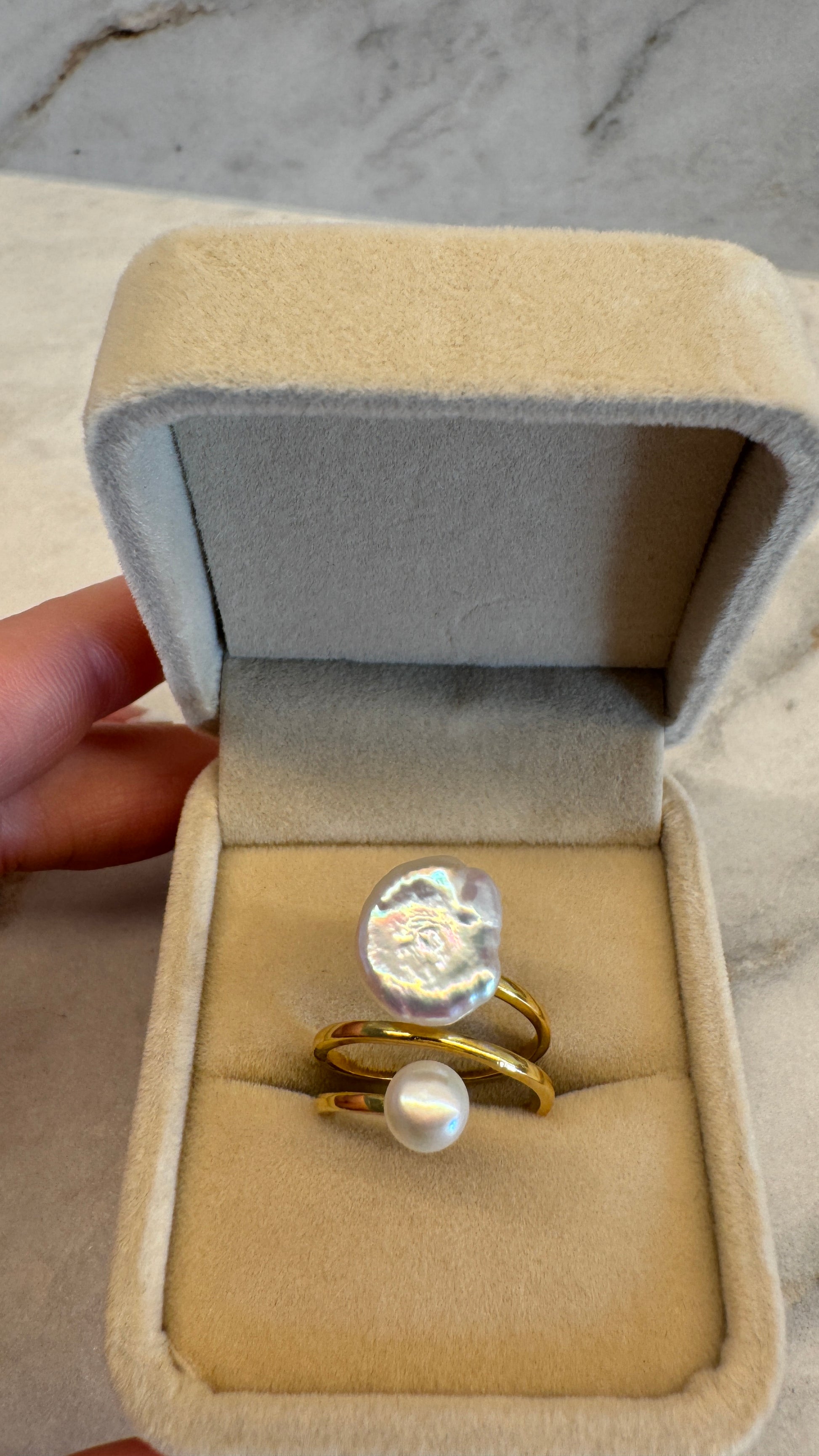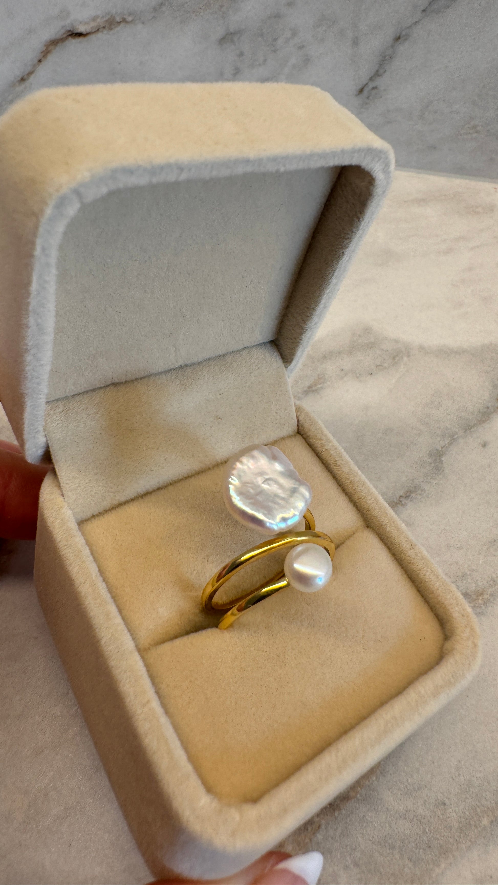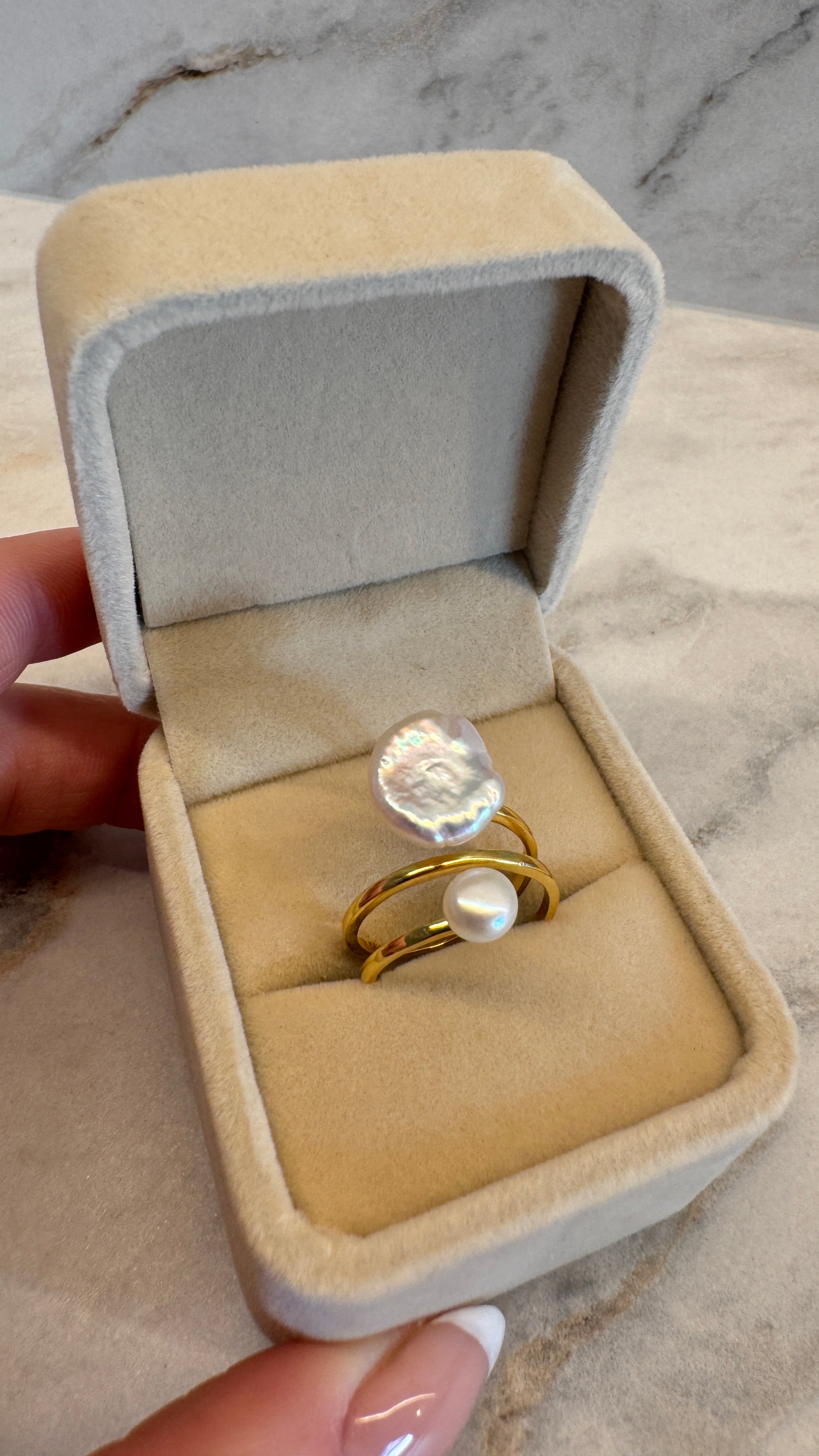 Deze ring uit de Monet+ collectie speelt met contrast: de organische vorm van een handgeselecteerde coin-keshi parel gecombineerd met de verfijnde harmonie van een ronde witte parel. Het resultaat is een sculpturaal statement dat zacht om de vinger rust en moeiteloos luxe uitstraalt.