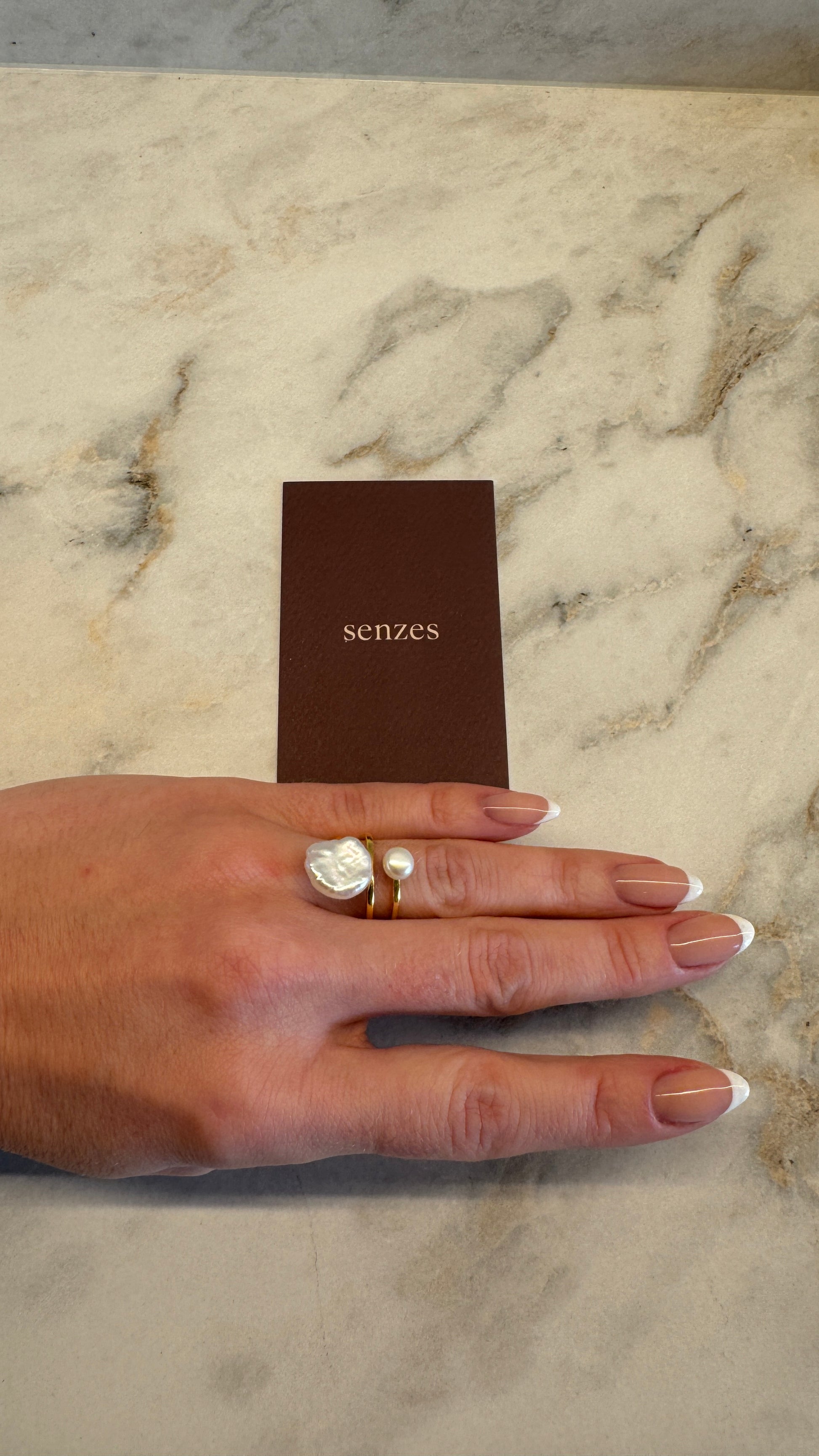De open ringdrager in 18K verguld goud volgt een vloeiende lijn rond de vinger en creëert een subtiel gevoel van ruimte — een signatuur binnen de moderne Senzes-esthetiek.